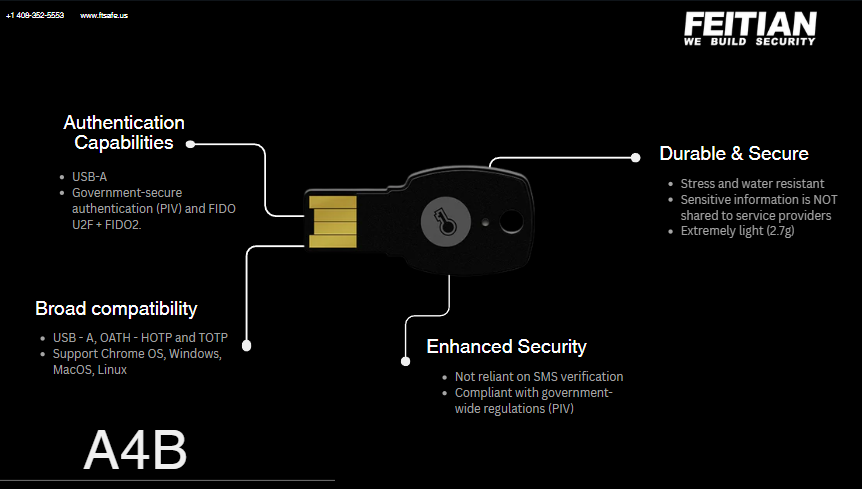 FEITIAN ePass FIDO2 (A4B) proposed the most cost-effective solution to solve the password problems. As an authenticator certified by both FIDO2 and FIDO U2F, the security key are capable to provide easier and safer authentication to web applications.